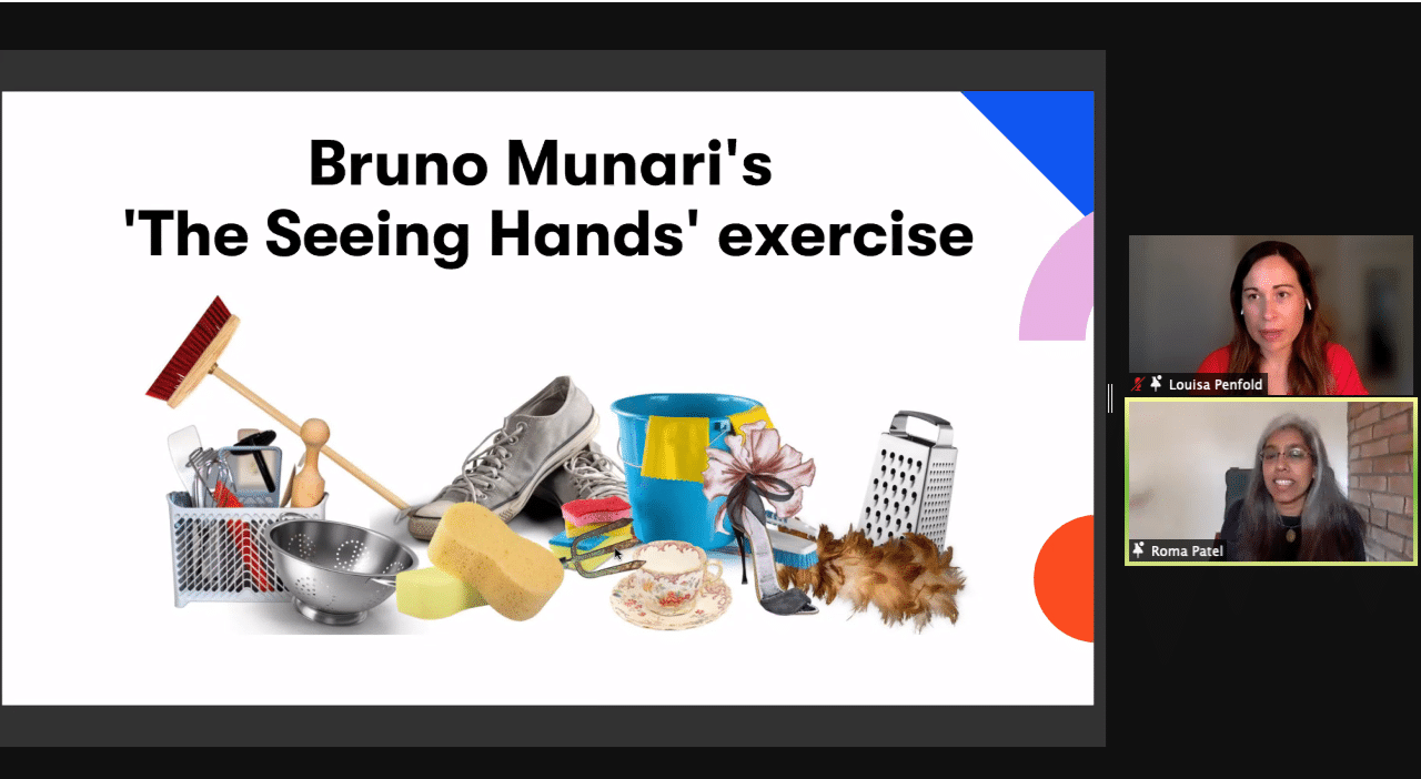 Thinking about tactile interactivity Roma introduced Munari’s “Seeing Hands” exercise – exploring touch as a sensorial process. Touching and exploring everyday objects with our eyes closed, using our hands, the skin on our arms and face, we were invited to think about the sensations that might be different if we had our eyes open. Regarding our hands as ‘seeing’ in this way might help us to relate to how children might experience materials. Adults tend to be visually dominant and this exercise helps us to foreground other sensations. The different material properties of the objects have different affordances that also change our experiences forming aesthetic interactivities.